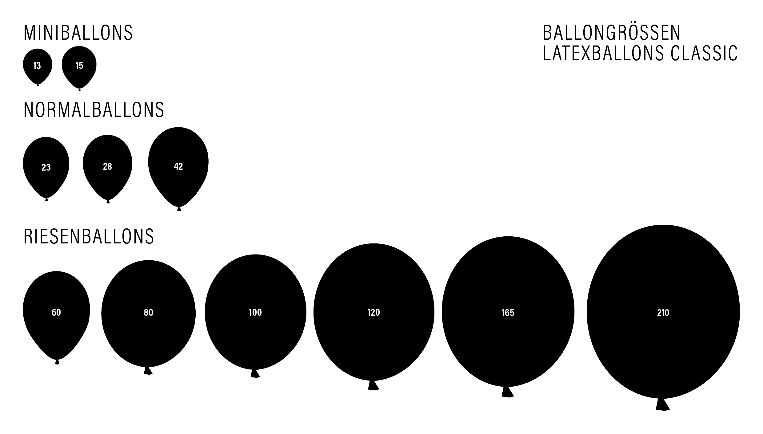vom kleinen Hingucker bis zum großen Statement. Die Standardgröße, die fast jeder kennt, misst 28 cm im Durchmesser. Auf dem passenden Größenvergleich sieht man auf einen Blick, wie sich die anderen Ballongrößen, die wir führen, im Verhältnis dazu unterscheiden. So lässt sich ganz einfach der passende Ballon für jeden Anlass finden – ob dezent, auffällig oder richtig beeindruckend.