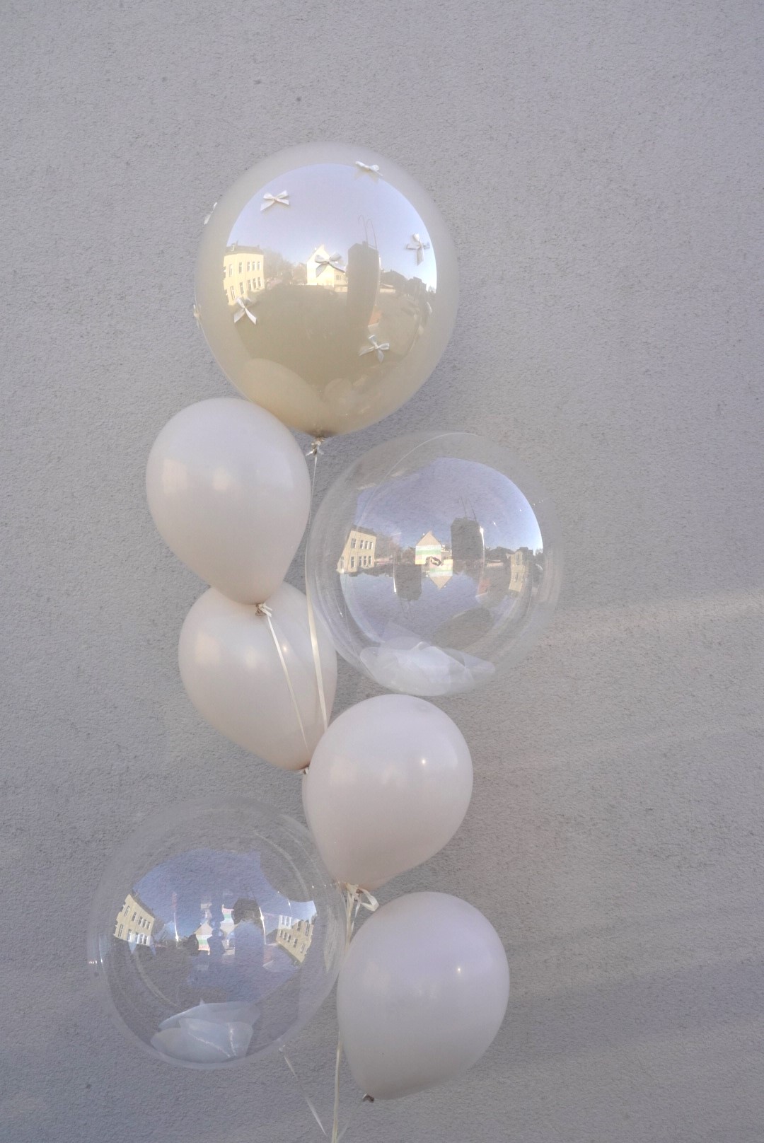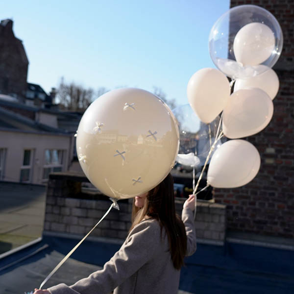 Bestehend aus 2 kleinen Bubbles inkl. Satinband, 1x Bow-Bubble groß, White Sand, inkl. Schleifen, 4 Latexballons (inkl. Hi-Float für längere Schwebezeit)