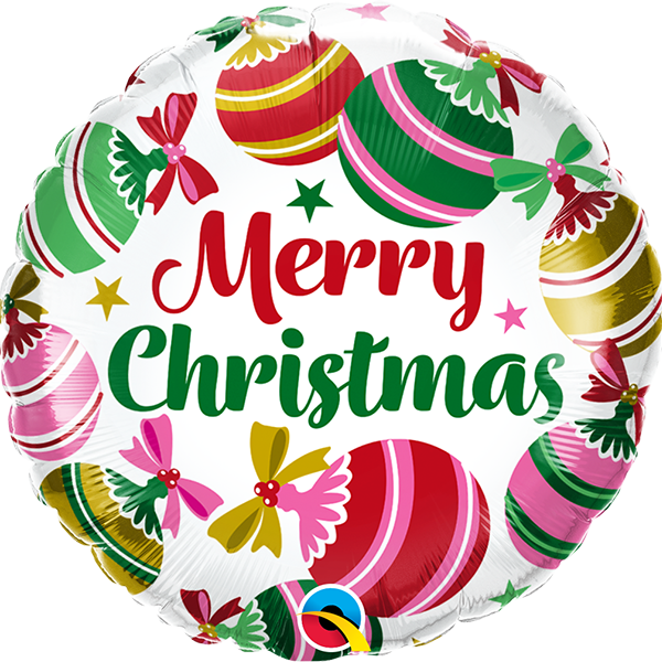 Wunderschöner klassischer runder Folienballon, bedruckt mit fröhlichem Weihnachtsgruß und nostalgischen Christbaumkugeln.