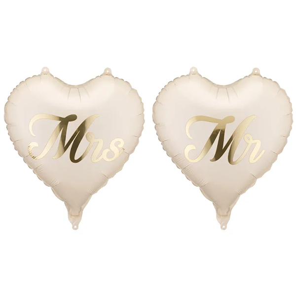 Mr. und Mrs. Folienballon-Set zur Hochzeit. Das Set besteht aus zwei stilvollen Herzballons in einem edlen Beige-Ton mit glänzender goldener Schrift. Die liebevollen Aufschriften „Mr.“ und „Mrs.“ machen diese Ballons zur perfekten Dekoration oder Geschenk für Hochzeiten.