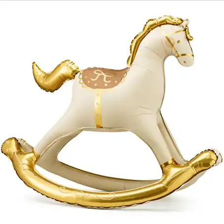 Ein Schaukelpferd Folienballon, luftgefüllt und selbststehend. Dieser Ballon kann immer wieder aufgefüllt werden. Ein toller Hingucker für Babygeburtstage oder kleine Pferde Fans.