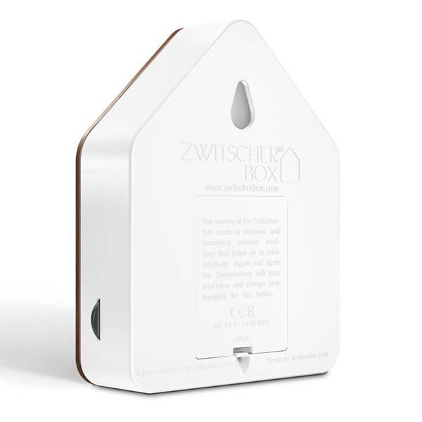 Die Zwitscherbox kann überall aufgestellt oder an die Wand gehängt werden. Das Zwitschern wird durch einen Bewegungsmelder aktiviert. Kommt kein neuer Impuls, fadet der Sound nach ca. zwei Minuten wieder aus. Mit dem kleinen Rädchen an der Seite kann die Lautstärke optimal angepasst, oder die Zwitscherbox ausgeschaltet werden. Betrieben wird die Zwitscherbox von drei handelsüblichen AA-Batterien.